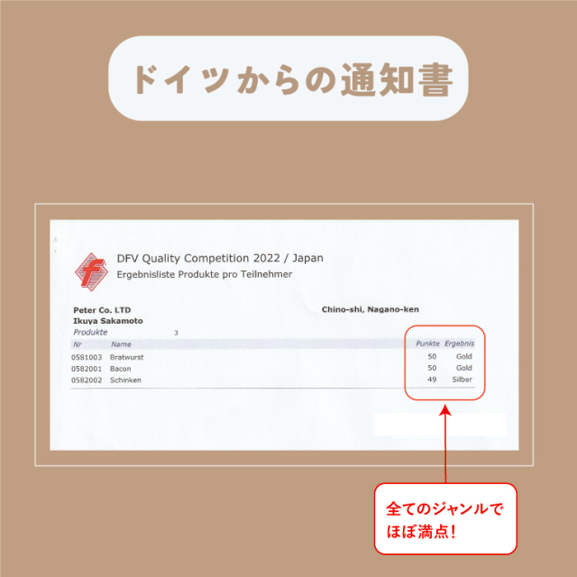 ドイツ食肉連盟(DFV)が主催する「IFFA加工品品質コンテスト」が日本で2022年に開催され、861(ハムイチ)のベーコン・ビアリングソーセージが金賞、ハムが銀賞を受賞しました!