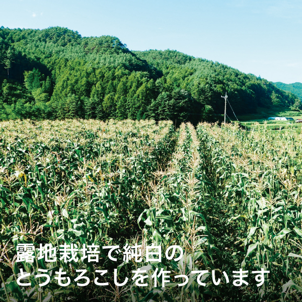 ハチカッテの大人気商品「八ヶ岳生とうもろこし」は黄色いとうもろこしですが、諏訪の里山からはピュアホワイトという「幻の白いとうもろこし」をお届けします。幻と呼ばれる由縁はその珍しさから。白いとうもろこしは黄色いとうもろこしの花粉が混じるとまだら模様になってしまうため、通常はビニールハウスなど限られた環境でしか栽培することが出来ません。後山地区は山に囲まれた地形を活かし、黄色いとうもろこしを作らないなどの努力で、露地栽培で純白のとうもろこしを作っています。