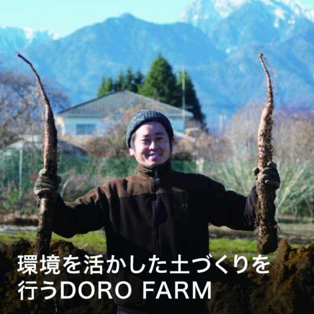 山梨県北杜市武川で、環境と土づくりにこだわりながら、野菜を育てているDORO FARM。八ヶ岳からの吹き下ろしを受け豊饒な土地と南アルプスの美味しい水で大事に育てられた武川町の根菜は、旨みがギュッと詰まり、香りも豊かです。農薬・化学肥料不使用なので皮ごとお召し上がりいただけます。